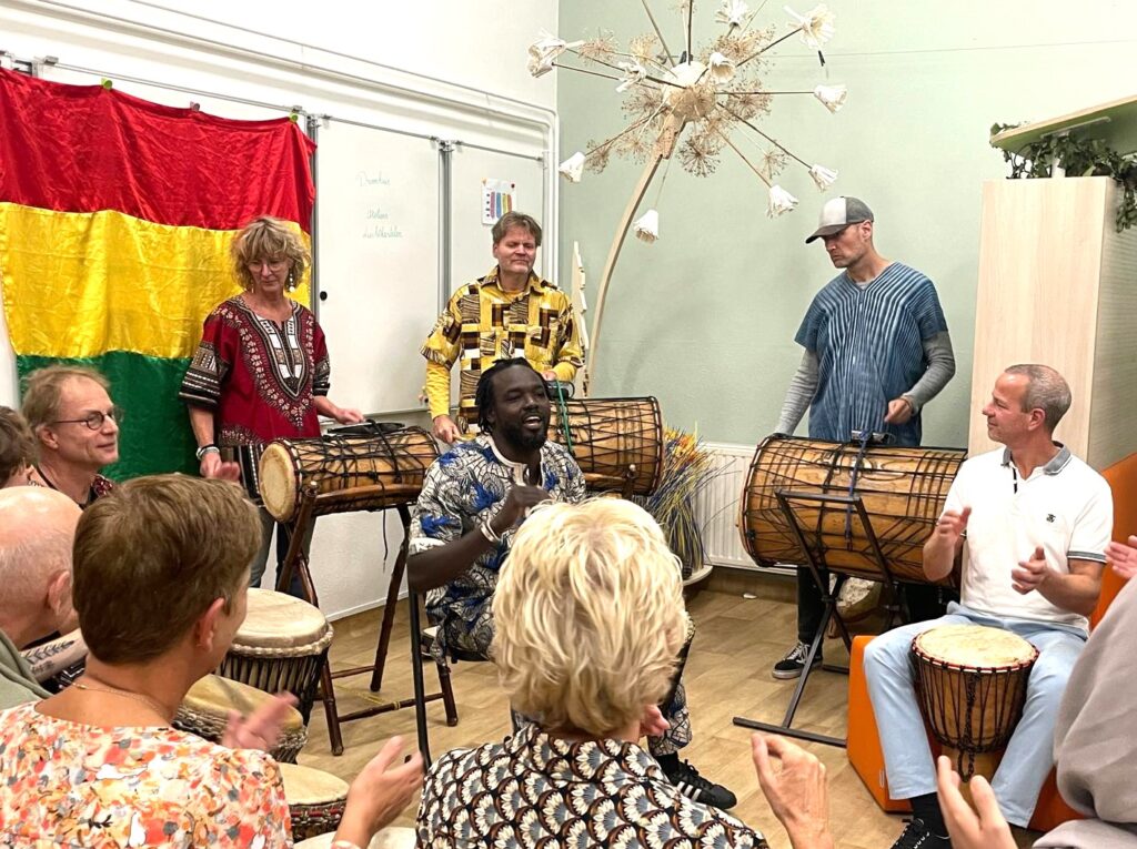 Het werd een gezellige avond met veel leuke ontmoetingen en smullen aan tafel. Daarnaast werd er nog een workshop Djembe spelen gegeven. Menigeen drumde driftig mee en werd opgezweept door de ritmes van de drums.