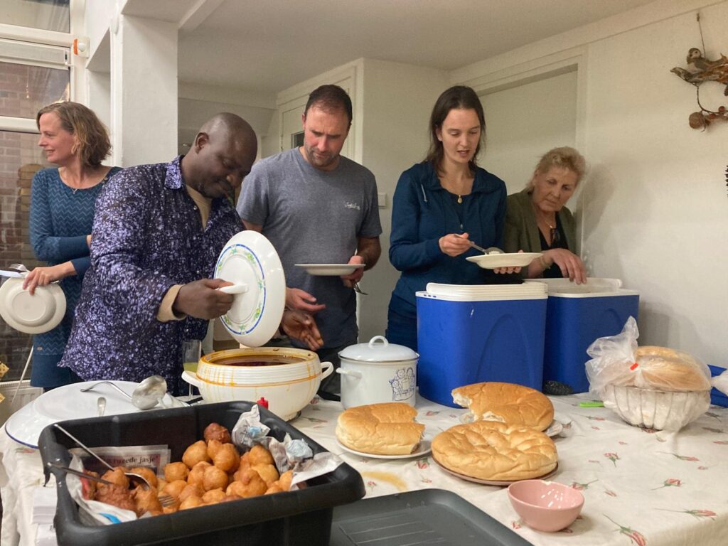 Vrijdagavond 18 oktober 2024 was het dan eindelijk zover. In de Antonusschool in De Hoef, thuisbasis van Paulien Burgering, werd een sponsordiner gehouden ten bate van stichting Nanah. Bayo’s neef Kutumbu had samen met zijn vrouw en tante heerlijke Guinese gerechten gemaakt variërend van ‘Guinese oliebollen’ tot kipkluifjes en groenten. Ook aan de vegetariërs was gedacht.